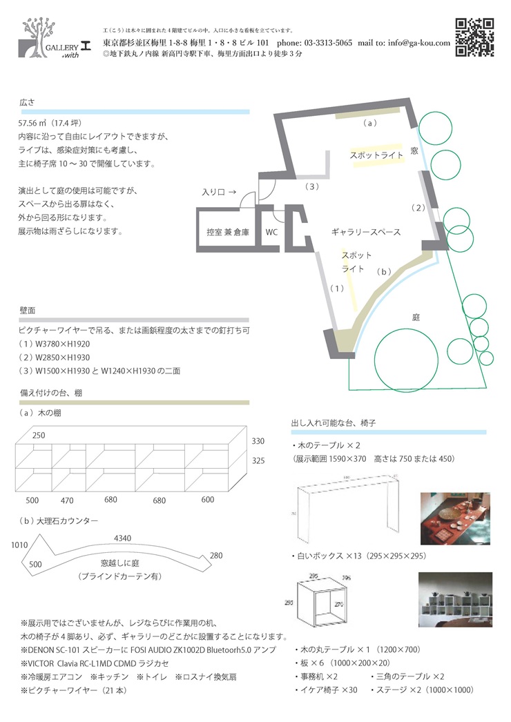 GALLERY工+withは、人と物と事を繋ぐ、木々に囲まれたスペースです。(演芸のイベントについては梅里一八八という屋号も使用しています。)最寄り駅は新高円寺より徒歩3分。また、有限会社工企画として、展覧会や落語会、音楽会の企画の主催や協力もしています。日常生活に「クリエイティビティ」を取り入れることを提案します。どうぞ宜しくお願いいたします。