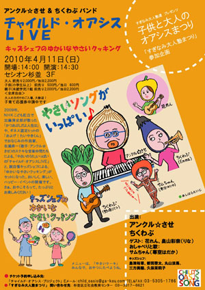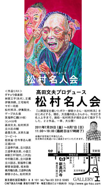 | 佐瀬 ところで、こっちも随分付き合わされたけど、ギャラリー工【こう】では、落語や音楽LIVEも色々やったんじゃないの? 濱田 はい、チャイルド・オアシスLIVEもやりましたけど、イソノさんのもうひとつの顔、柳家小春さんの粋曲や、ボサノヴァの会。 落語会でいえば、人気二つ目、立川こはるさんの勉強会を定期的に。同じ立川流では、「キウイto吉笑ふたり会」。これには高田文夫氏も聴きに来てくれて、吉笑さんを大絶賛! 本山 自分も聴いたけど、吉笑はいいね。すっかりファンになっちゃったよ。 櫻井 こうしたイベントでいえば、自画自賛だけど、「チャイルド・オアシス・プロジェクト」が企画・プロデュースして、座・高円寺でやった「夕やけハミングSHOW」は、なかなかのものでした。 佐瀬 黒字にしようと昼・夜2回公演やったんだけど、夜の部は疲れちゃってボロボロだったけどね。 濱田 もう若くないからね。出演してくれたのは、ちくわぶ、バロン世界一周トリオ、渡邉理、山田あずさ、林家ペー&パー子、まきみちる、寒空はだかの皆さんでした。 |