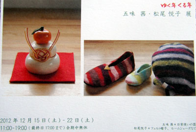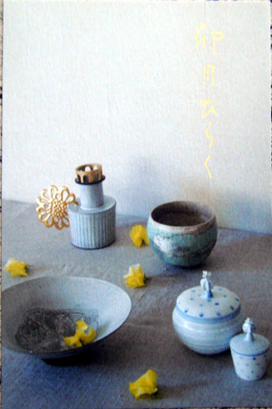 +Withも助かります。ウフフッ! それから展覧会のこと、もう少しお話しさせていただくと、今年のこれからは、「村田肇一陶展」、「篠塚裕子陶展」、「皿海佐多子Bag展」、 「山下枝梨子染織展」、「中田太陽陶展」、その他にも2人展、グループ展が予定されています。 |