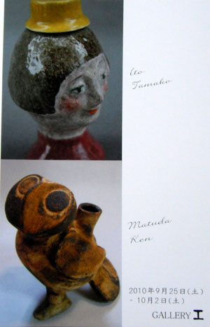 | 郁子 それからですね、違うジャンルのお友だちの作家さんとコラボして2人展をやったり、グループ展でやっていたお仲間が2人展をやったり、なんていうケースもたくさんありました。 「陶+フェルト」ヨシダユキさん、徂徠友香子さん。「温かな贈り物」五味茜さん、松尾悦子さん。「木×陶」岡田敏幸さん、岩淵真理さん。 「陶展」 伊藤珠子さん、松田剣さん。このお2人に彫刻の牧田草平さんが加わった+ワンの展覧会もありました。「ガラスとTシャツ」当間頼子さん、イソノヨウコさん。「漆と陶」林宏さんと渡辺国夫さんといった感じです。 |