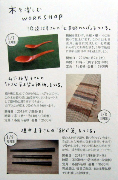 | 郁子 スケッチ塾といえば、後、ギャラリー工【こう】では、お教室もやっていて、今は、もう終わってしまったんですけど、沖文さんの和刺繍は、8年位続きましたし、 柳家小春さんの三味線教室は、今でも続いています。始が弟子第1号なんですよ。そして、時々、ワークショップも開催しています。このDMは、木を楽しむワークショップです。 |