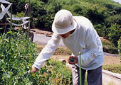 | さて、いつもわが家のゴルデンウィークの1日は、畑仕事と決まっていました。夏野菜のキューリ、ナス、トマト、ピーマン、唐辛子etc…。苗屋で買ってきた元気な苗を、三人で手分けして植えるのです。もちろん西瓜にもチャレンジしました。 畑には、冬を越したハーブたちが、鮮やかな新芽を伸ばし、セイジにはもう花がついていたりします。ブルーベリーも順調に育っているし、自然にこぼれたコスモスの種も芽を出し始め、キャベツもしっかり丸まり 始めています。 フェンネルによく似たディルもたくさん芽吹いているしカモミールも機嫌よく育っています。農薬を使わないうちの畑の野菜たちは、虫食いだけど本当にひと味もふた味も違うおいしさなのです。 |