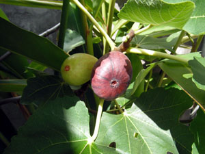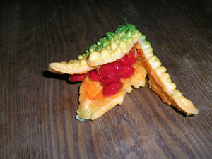 イチジクが熟すと翌朝の朝のデザートになります。ゴーヤが熟すとこんなにカラフル。中の赤いのは、種であります。