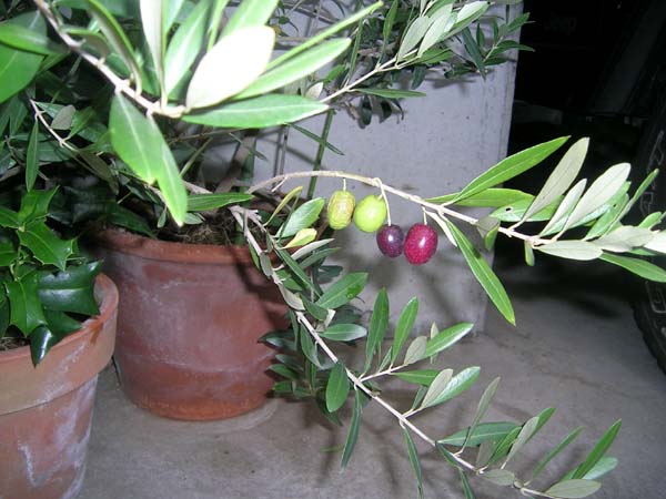 エントランスのオリーブが色づきました。 確か収穫した10数粒を、家人が塩漬けにしたので、ワインのツマミに大切に食べました。