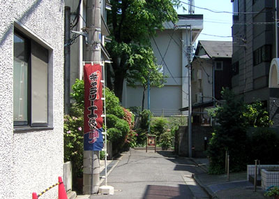 私道には、ギャラリー工【こう】の幟なども出したりします。橘右橘さんの寄席文字です。
