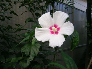 ギャラリー脇の遊歩道では、木槿(むくげ)の花がいい感じ。ピラカンサスなどの生垣に、ジリジリと夏の陽射しが降り注ぎます。