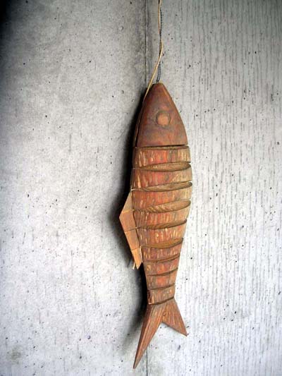これは、豆柿の落合さんが開いたアンティークショップで 購入した、大きな魚を釣る疑似餌で、横に入っている線のところで、魚体が動くようになっています。