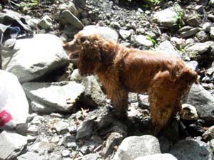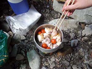 コールマンのキャンプ用コンロで、お昼に鶏肉とトマトを炒めて食べました。CoCoにも特別にお相伴しました。