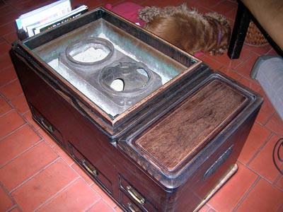 | 長火鉢にガラスを入れて小テーブルとして使っています。奥でCoCoが寝ています。 |