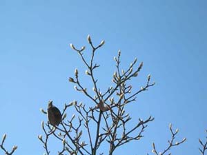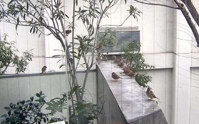 近頃、都会ではスズメが少なくなっているようですが、ここには、ホラ、この通り。4Fさんが、毎日、餌を蒔くからであります。 |