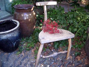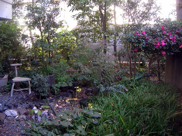 この庭に植えられている植物は、大けやきの下、まずは山茶花。その横には、シダジイ。そして、カナメモチ。その手前のもみじは、アオシダレ。ヤブソテツがあり、ワッと広がる吉祥草。ツワブキには黄色い花が咲き、海老根やネズミモチ。甕の中には、金魚とメダカ。その横の椅子は、自然木を生かした武笠さん作。他に富貴草などもあります。 |