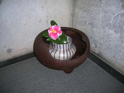 | 茶の風炉に麦藁縞の壺を入れ花入れに。 |
