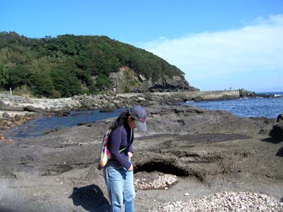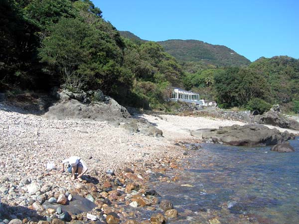 伊豆のこの辺の海岸には、金を含んだ石英礫が打ち上げられていることがあるとか。 いつも波に洗われているので礫の表面がきれいで金を見つけやすいということですが、もちろん、この日は、金などみつかりませんでした。が、水晶の結晶が付着した石英はたくさん拾えました。 |
